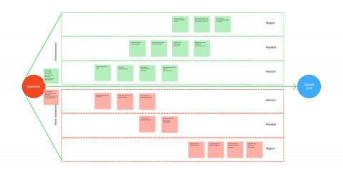 Der Workshop startete mit dem Polak Game als Warm-up. Die Teilnehmenden positionierten sich auf zwei Achsen zu zwei Fragen: ob die Zukunft eher positiv oder negativ eingeschätzt wird und wie groß der eigene Einfluss auf das Umfeld ist. Insgesamt überwog eine optimistische Einschätzung. Fortschritte etwa in Medizin und Menschenrechten wurden häufig genannt. Aktuelle politische Ereignisse führten jedoch bei einigen zu skeptischen Einschätzungen. Im Anschluss wurde die STEEP-Methode angewendet. Mitgebrachte Kärtchen mit Trends und Signalen wurden den fünf Kategorien zugeordnet und anschließend in der Gruppe diskutiert. Aus der Diskussion entstanden erste Themen, Cluster und Möglichkeitsfelder. Darauf aufbauend wurde in Teams ein Futures Wheel erstellt. Diese Methode ist eine kreative Form der Zukunftsanalyse: Ausgehend von einer zentralen Veränderung werden direkte und indirekte Folgen als radial aufgebautes Ursache-Wirkung-Netzwerk visualisiert. Ausgangspunkt war die Annahme, dass Kreislaufwirtschaft im Jahr 2035 verbindlich sein wird. Daraus wurde ein 2x2-Modell abgeleitet, das vier mögliche Zukunftsszenarien abbildet. Die Szenarien untersuchen unterschiedliche Leasing- und Kaufmodelle, sowohl aus Sicht von Festool als auch aus Perspektive der Kund:innen. Das anschließende „Name-It“ veranschaulicht eine mögliche Zukunft, in der Werkzeuge gemeinschaftlich genutzt und geteilt werden: der öffentliche Toolverkehr.